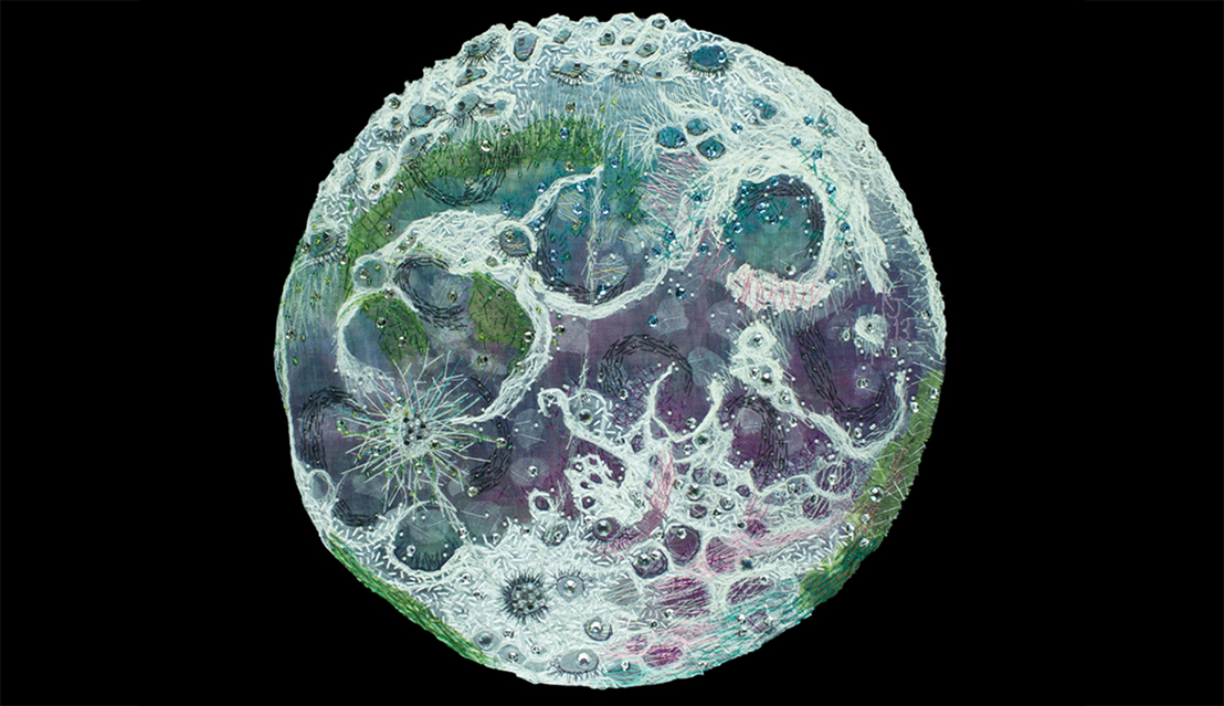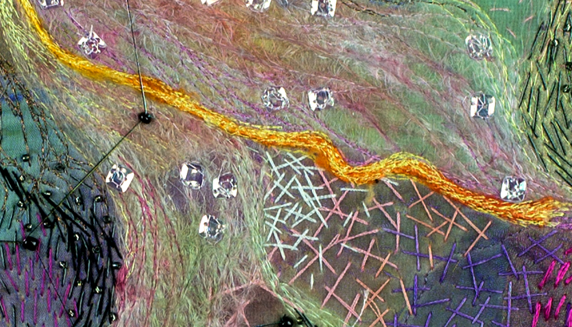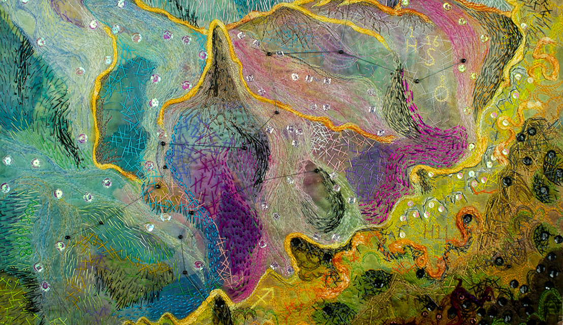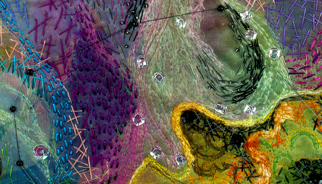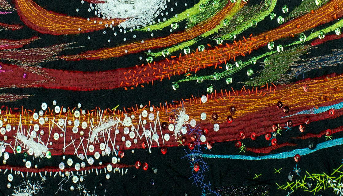 In this new body of work I have been captivated by the wonderment of the universe - its population of planets, stars, nebulae, moons, white dwarfs and supernovae. They appear to me as enchanting and colourful objects; a cosmic ocean of wonderful and fascinating patterns, shapes and colours - a great celestial beauty. My stitches are a way of exploring the beauty of the universe in terms of structure, composition and texture. A homage in fabric. These dyed, collaged and stitched embroidered pieces are patches of the universe and my expression of the magnificence of the Cosmos and all it has to offer in terms of a visual experience.